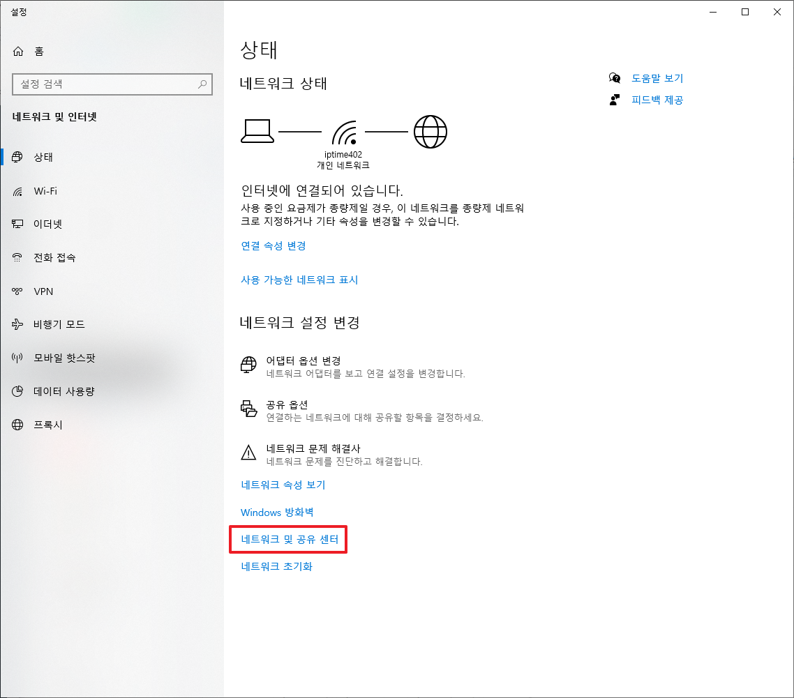 위의 화면에서 [네트워크 및 인터넷 설정 열기] 부분을 클릭하여 주시면 다음과 같은 화면이 나타납니다. 여기에서 [네트워크 및 공유 센터]를 클릭하여 주시길 바랍니다.
