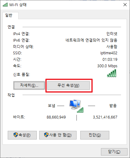 그럼 다음과 같이 [Wi-Fi상태]가 나타날 것입니다. 여기에서 [무선 속성] 부분을 클릭하여 주시길 바랍니다.