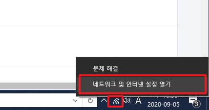 먼저, 하면 하단에 있는 무선인터넷 연결 표시가 되어 있는 부분을 클릭하시면 다음과 같이 2개의 메뉴가 나타납니다.