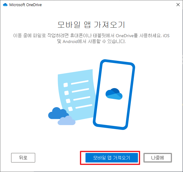 위에서 구지 모바일 앱 가져오기를 안하시고 나중에 버튼을 클릭하셔도 됩니다. 그럼, 모든 준비가 완료되어 다음과 같이 원드라이브(OneDrive)가 준비되어 있다는 부분에 대해서 이야기를 합니다.