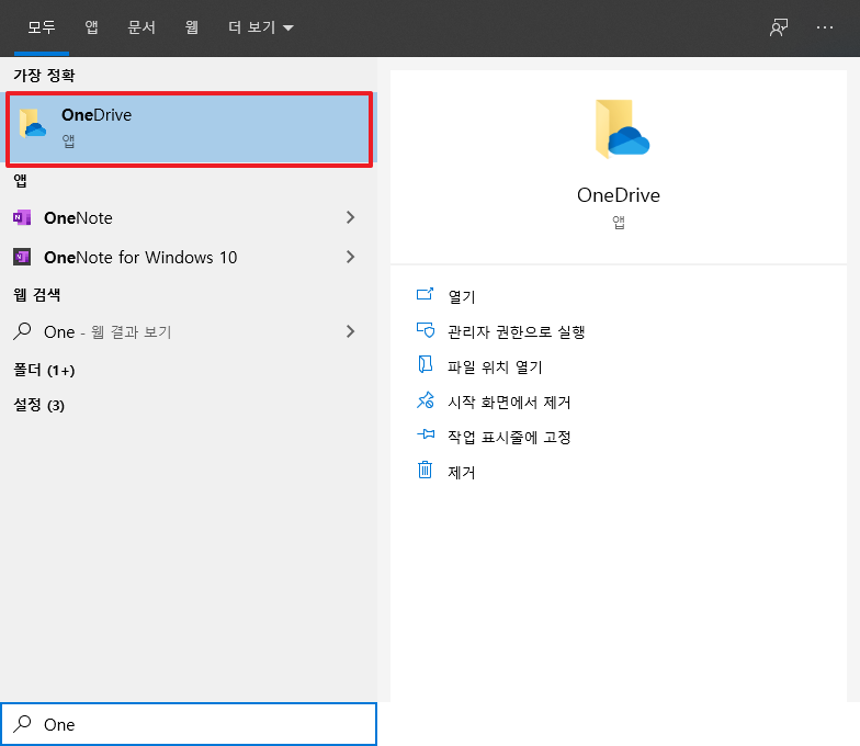 먼저, 윈도우 메뉴에서 "OneDrive"을 검색하여 다음과 같이 보이는 부분을 실행시켜 주시길 바랍니다.