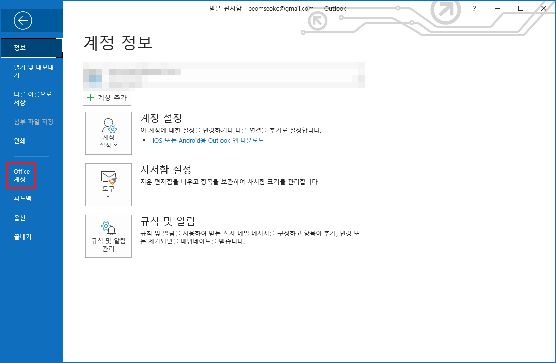 위에서 [파일]부분을 클릭하시면 다음과 같은 화면이 나타날 것입니다. 여기에서 좌측 메뉴에 있는 [Office 계정]부분을 클릭하여 주시길 바랍니다.