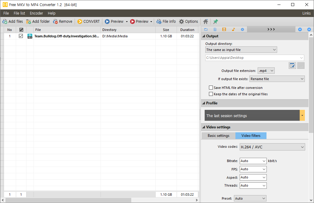 Free program that converts MKV files to MP4. For encoding the video stream the application can use modern H.264 and H.265 encoder