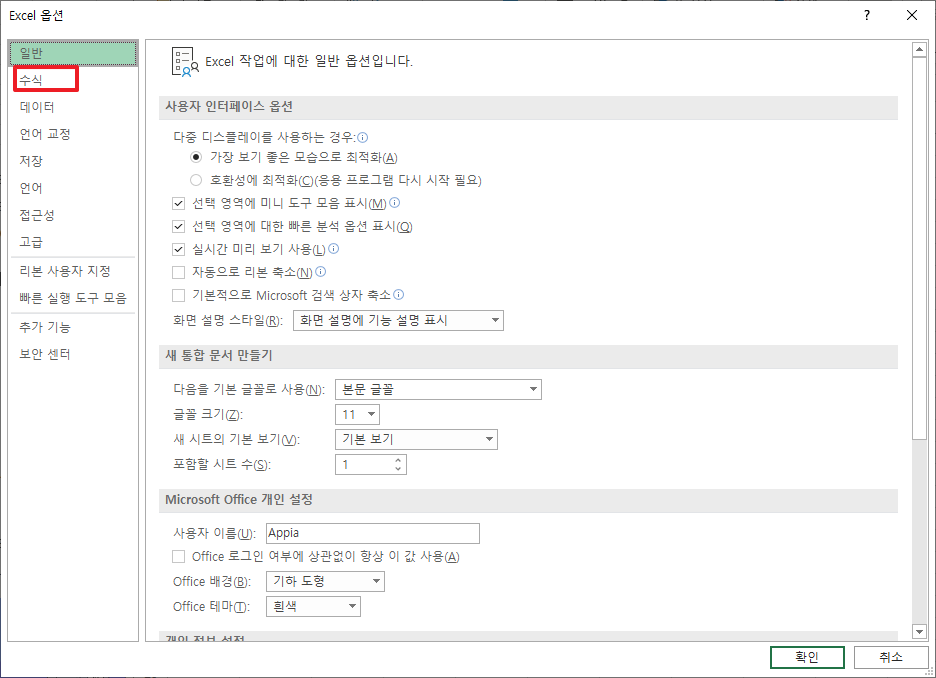 위에서 [옵션]부분을 클릭하시면 다음과 같은 메뉴가 나타납니다. 이 때, 좌측에 있는 [수식]부분을 클릭하여 주시길 바랍니다.