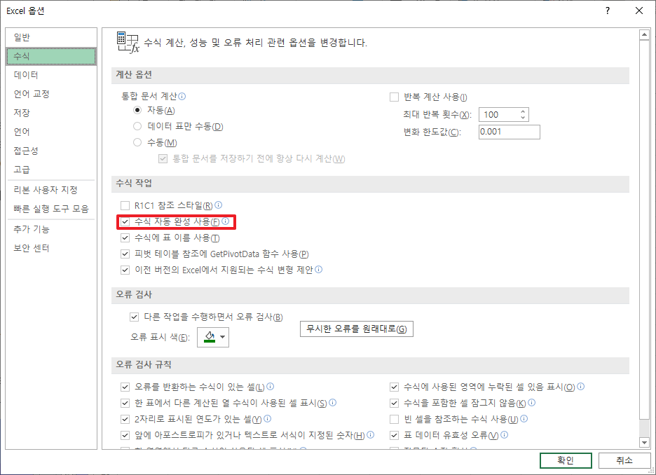 엑셀[Excel] 365 수식 자동 입력 완성 설정, 해제 하기