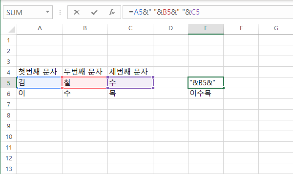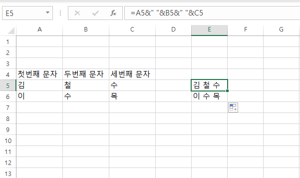 위와 같은 형태로 셀들의 문자를 하나로 합칠 수 있습니다.