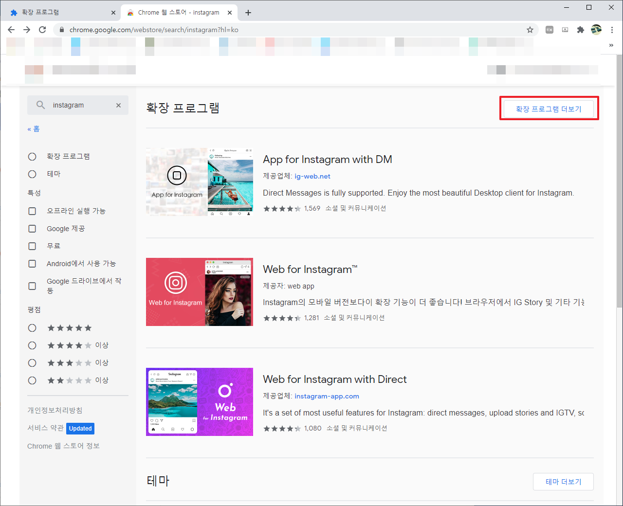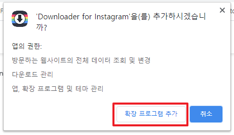 그래서 다음과 같이 Donwloader for Instagram을 검색하였습니다. 그래서 다음과 같이 하기 빨간 상자 부분을 클릭하였습니다.