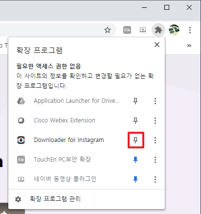 그럼 다음 보이는 부분에서 설치한 Downloader for Instagram 부분의 고정핀 부분을 클릭하여 주시길 바랍니다.