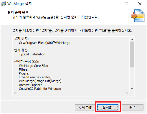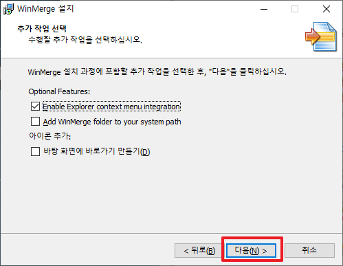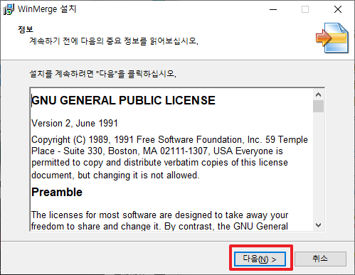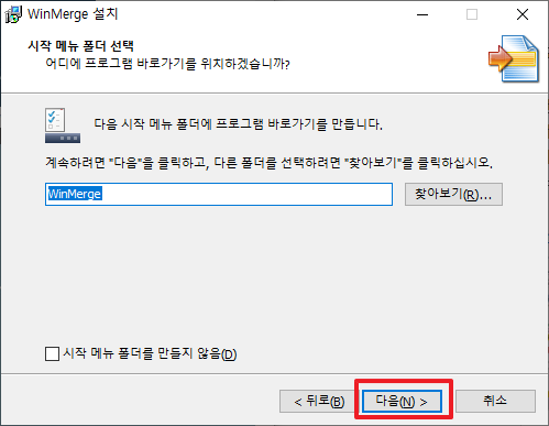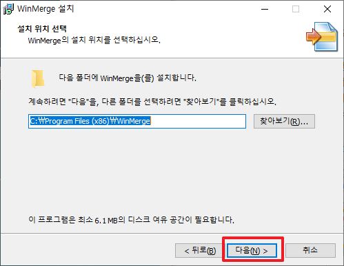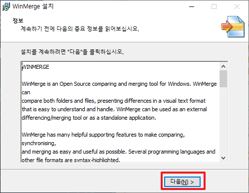 그러면 다음과 같이 WinMerge 설치가 진행됩니다. 여기에서 [다음] 버튼을 클릭하여 주시길 바랍니다.