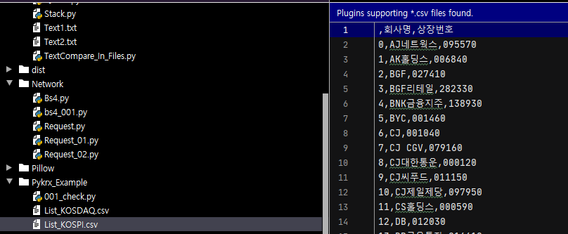앞서서, 코스피나 코스닥의 상장 번호리스트들을 받아서 각 부분들을 회사명과 상장번호로 출력하기로 하였습니다. 단, 이때 향후에 CSV로 추출할 것을 예상하여 pandas를 이용하였습니다.