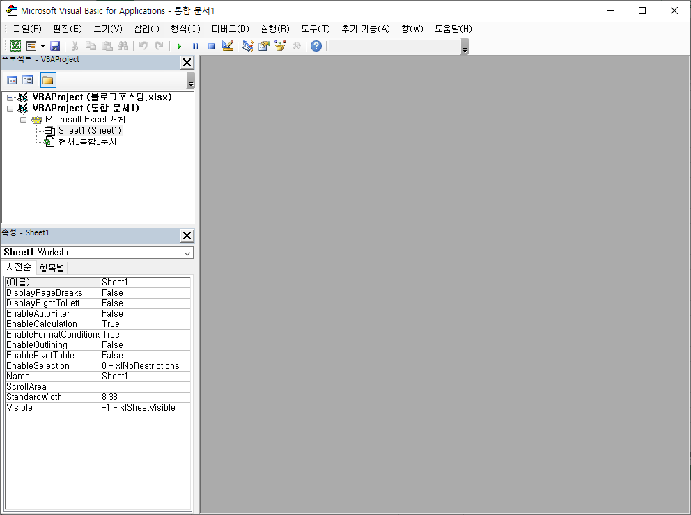 위에서 비주얼 베이지(VBA)을 실행하면 다음과 같은 화면이 나타납니다.