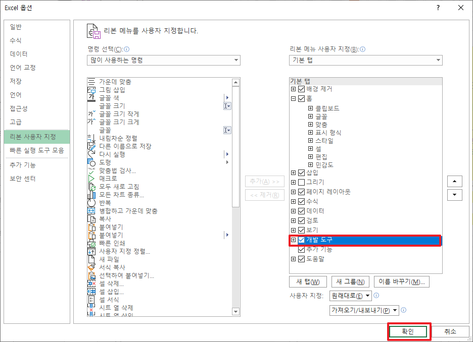 Appia 2020. 11. 15. 07:03엑셀(Excel) 매크로(Macro) 기본 환경설정, 개발자 도구 보이기 설정하기-