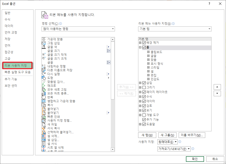 그럼 다음과 같이 Excel 옵션화면이 나타납니다. 여기에서 [리본 사용자 지정] 부분을 클릭하여 주시길 바랍니다.