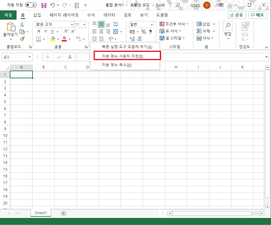 우선 메뉴바에서 오른쪽 버튼을 누르셔서 [리본 메뉴 사용자 지정] 부분을 클릭하여 주시면 됩니다.
