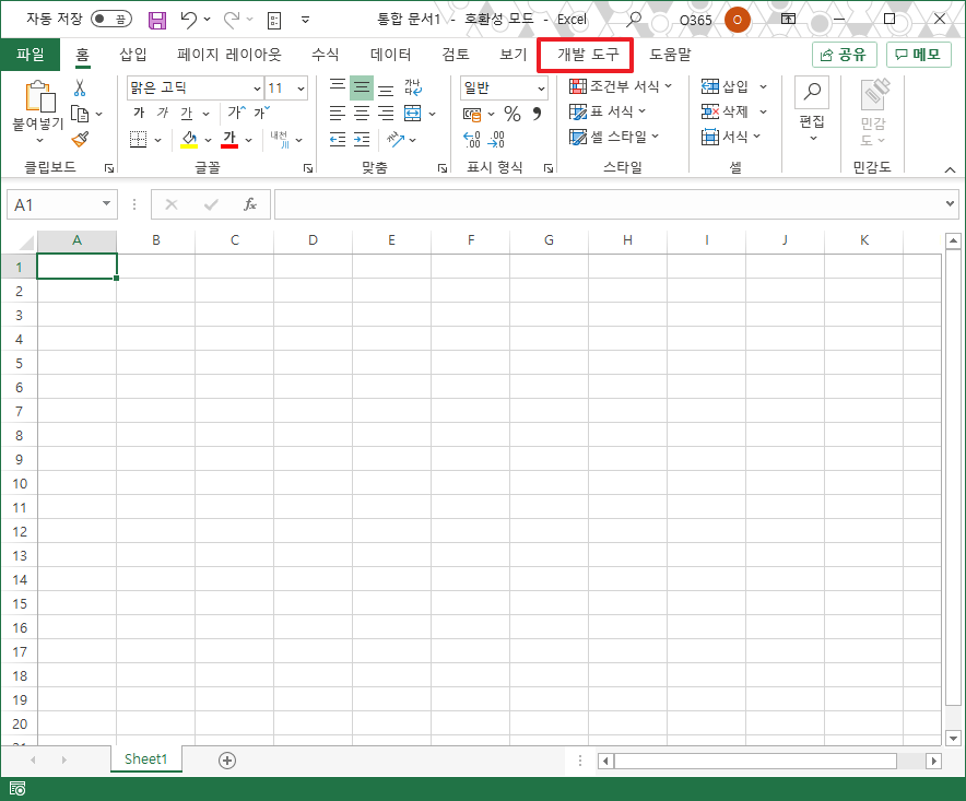그럼 엑셀(Excel) 메뉴 탭을 보시면 다음과 같이 [개발 도구]부분이 나타납니다.