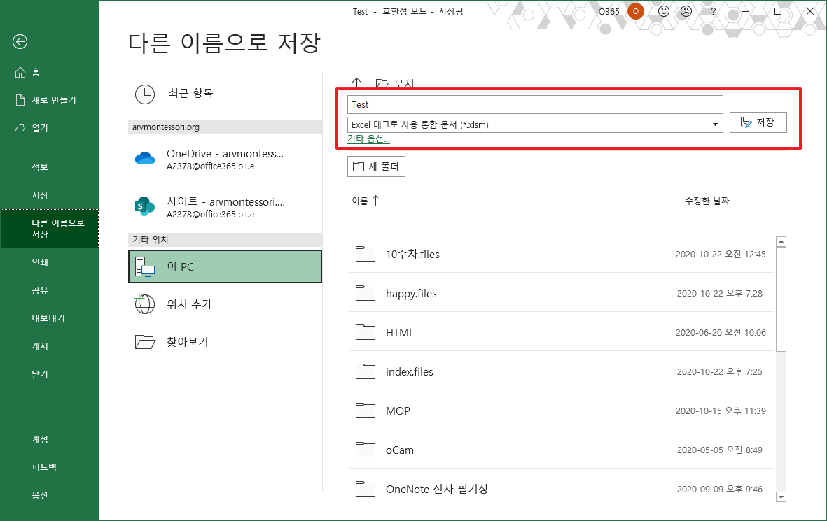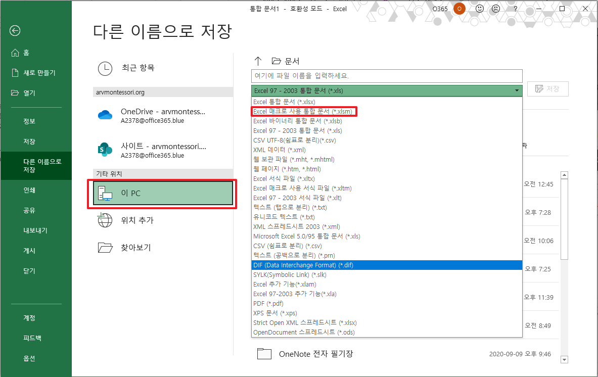 여기에서 기본 선택이 OneDisk로 되어 있기 때문에 제PC 환경으로 변경하여 주시고 파일 형태 부분을 클릭하여 나와 있는 메뉴중에 [Excel 매크로 사용통합 문서(*.xlsm)]을 선택하여 주시길 바랍니다.