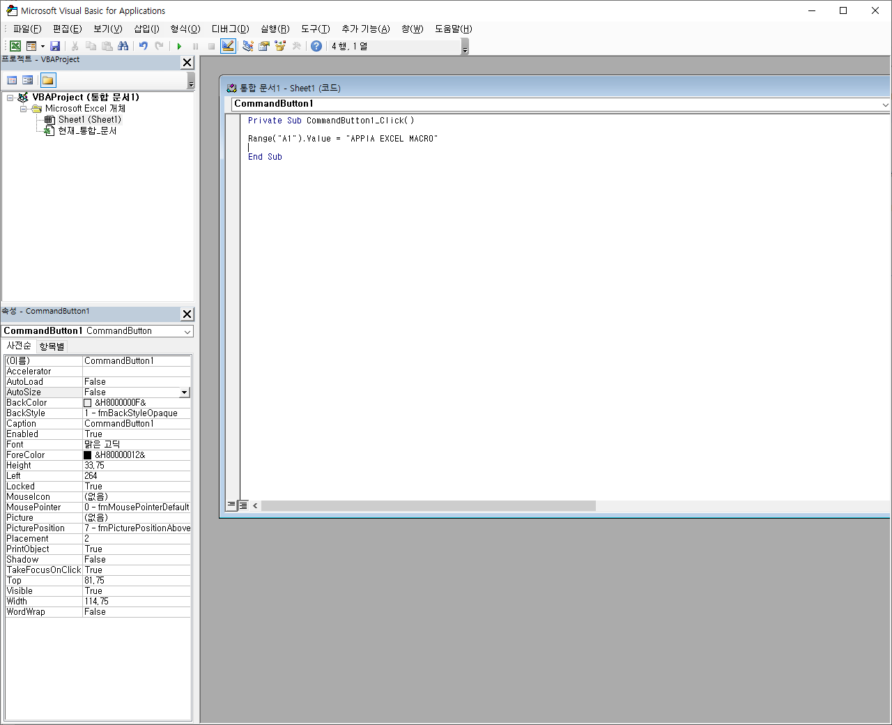위에 함수에 대해서는 이미 선언이 되어 있습니다. 사용자가 입력해야할 부분은 Range("A1").Value = "APPIA EXCEL MACRO" 와 같은 부분입니다.