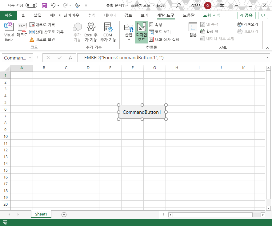 그럼 버튼을 눌러서 실행하기 전에 반드시 [디자인 모드]을 선택해지 해주셔야 합니다. 만약 [디자인 모드]가 선택되어 있으면 버튼이 실행되지 않고, 다음과 같이 선택만 됩니다.