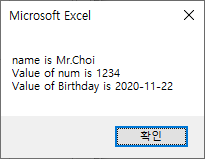 MsgBox ("name is " & name & Chr(10) & "Value of num is " & num & Chr(10) & "Value of Birthday is " & BirthDay)