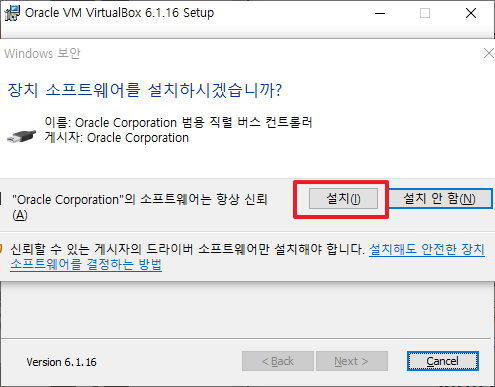 위에서 설치를 진행하면 다음과 같이 진행이 된다가 다음과 같이 오라클 Coration 범용 직렬 버스 컨트롤러에 대한 안내가 나타납니다. 이 때 [설치] 부분을 클릭하여 주시길 바랍니다.