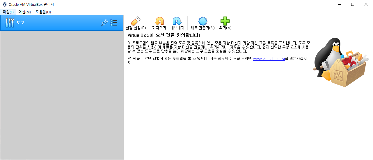 위에서 설치 종료후 실행 부분을 체크 했기 때문에 다음과 같이 정상적으로 오라클 버추얼 박스(Virtual Box)가 실행됩니다.