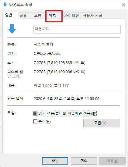 위의 과정을 거치고나면, 다음그림과 같이 다운로드 속성이 나타납니다. 여기에서 [위치] 부분을 클릭하여 주시길 바랍니다.