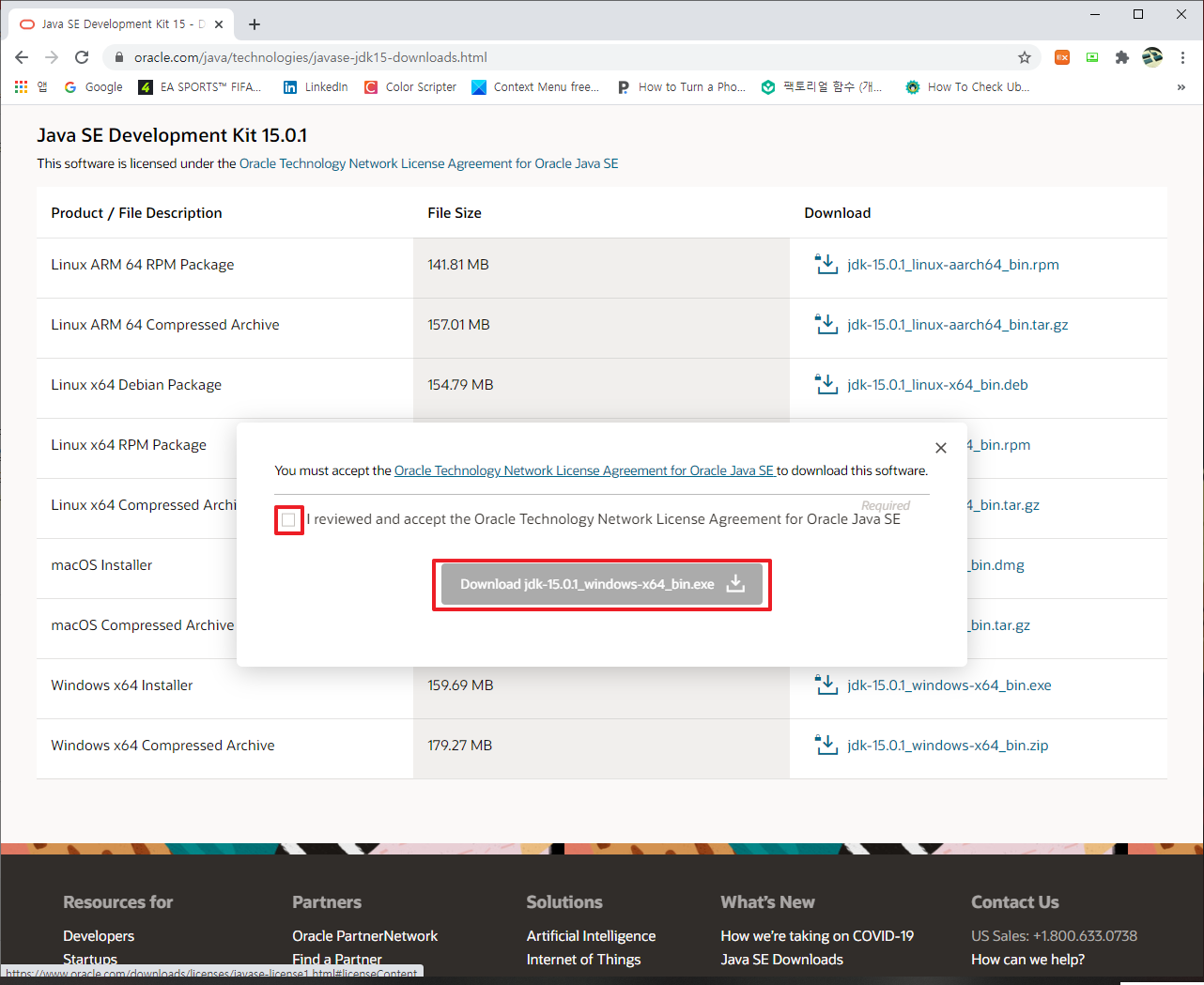 위의 과정을 마치면, 다음과 같은 화면이 나타날 것입니다. 먼저, 작은 상자 부분을 체크 해주시면, Download jdk-~ 부분이 활성화 될 것입니다. 그 때 활성화된 부분을 클릭하여 주시면 됩니다.