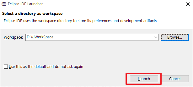 Eclipse를 실행시에 Workspace를 선택하게 됩니다. 저의 경우 별도의 폴더를 만들어 사용합니다.
