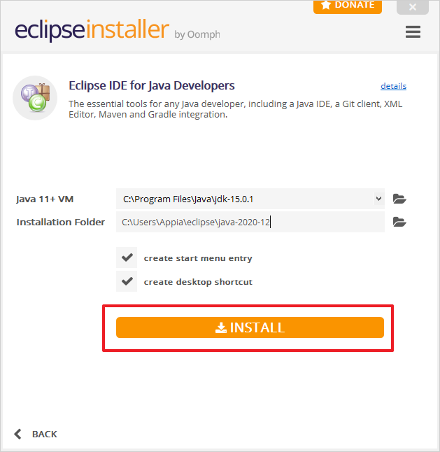 위 과정에서 JAVA / Enterprise JAVA 둘중에 하나를 선택하시면 됩니다. 그럼, 저의 경우 Eclipse IDE for Java Developers를 선택하였습니다. 그럼 다음과 같은 과정이 나타납니다. 여기에서 [Install]부분을 클릭하시면 됩니다.
