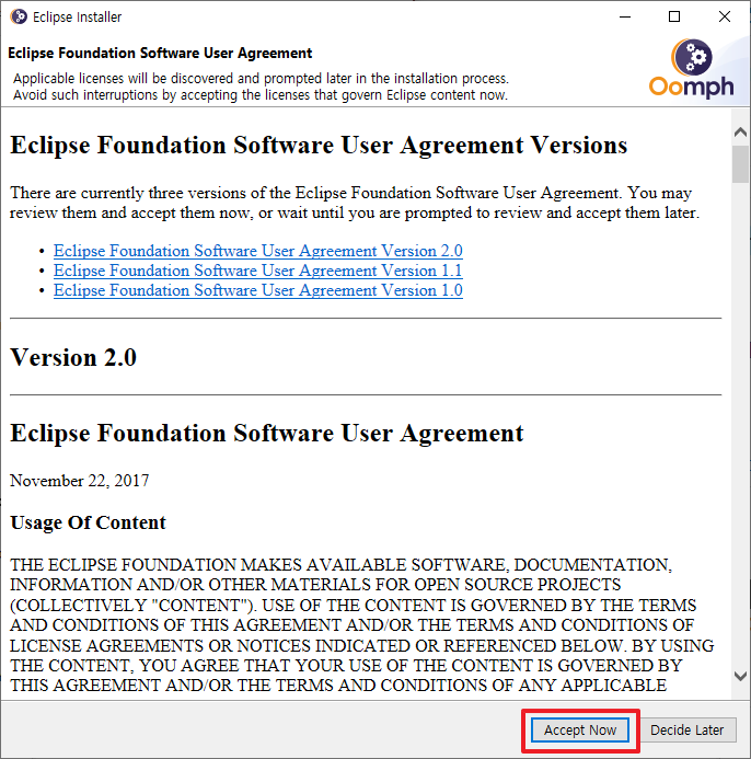 위의 과정에서 Install부분을 클릭하시면 다음과 같이 사용자 계약 관련 부분에 대해서 확인할 수 있습니다. 여기에서 Accept 하시면 됩니다.