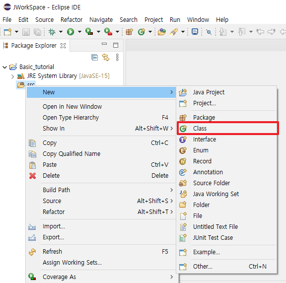 그럼 위에서 src 부분에서 우측 버튼을 클릭하여 주시길 바랍니다. 그런 후에 [New] - [Class]부분을 클릭하여 주시길 바랍니다.