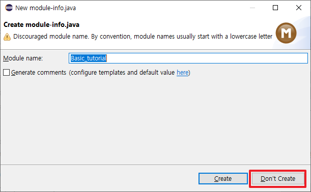 위에서 [Finish] 부분을 클릭하시면다음과 같이 New module-info.java 부분이라는 부분과 함께 모듈을 생성할 것인지에 대해서 문의를 합니다. 이 경우에 [Don't Care]로 관련된 모듈을 생성하지 않습니다.