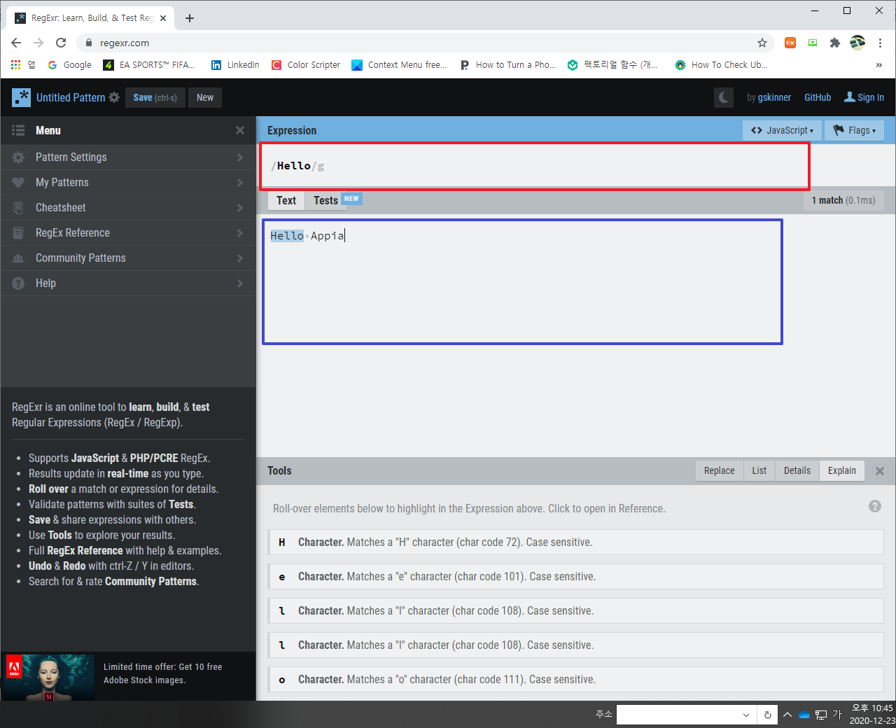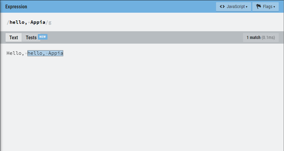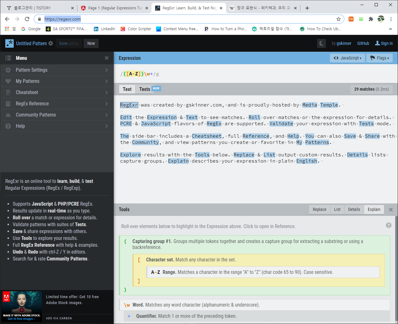 다음 사이트에서 적용대상인 텍스트를 파란 상자에 넣어 주시면 됩니다. 그리고, 여기에 정규식 부분을 빨간색 부분에 넣어주시면 됩니다.