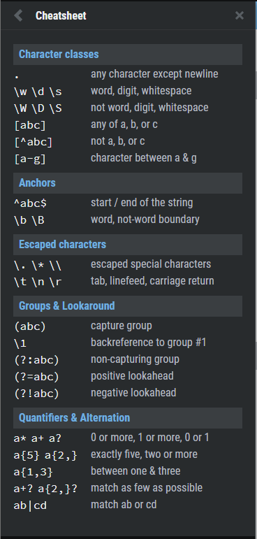 RegExr is an online tool to learn, build, & test Regular Expressions (RegEx / RegExp).