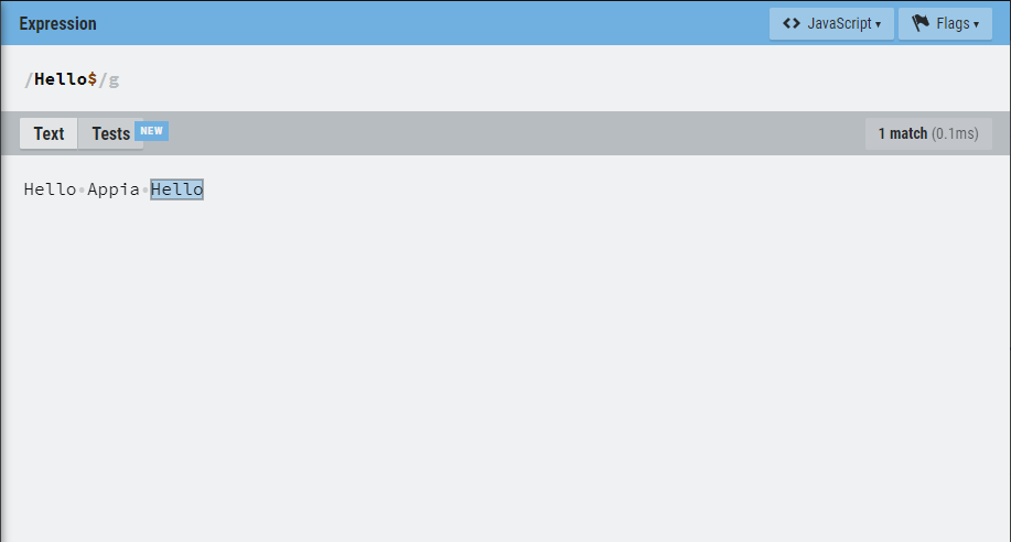 위에서 보이는 바와 같이 Hello는 시작과 끝에 각각 존재합니다. 하지만, 관련해서 ^로 인하여 시작 위치에 존재하는 Hello만 매칭이 됩니다. 물론, 문자열이 동일하지 않는다면, 매칭 되는 텍스트도 없을 것입니다.