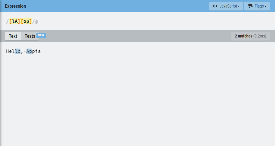 먼저, 위의 부분을 바탕으로 살펴보면, lA중에 하나로 시작하는 글자로 선택하고, 나머지 []로 에 있는 op중에 하나로 선택하게 됩니다. 이와 같은 방법으로 선별할 수 있습니다. 그럼 테스트 사이트에서 한번 적용해보도록 하겠습니다.