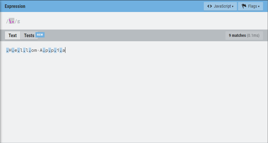 모든 문자를 선택하는 방법으로 . 을 정규 표현식으로 사용하면 됩니다. 그럼 간단히 다음과 같은 예시를 살펴보겠습니다.