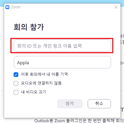 그럼 다음과 같은 부분이 나타날 것입니다. 여기에서 안내 받거나, 공유 받은 회의 ID를 입력하시면 Zoom을 이용한 회의가 시작될 것입니다.