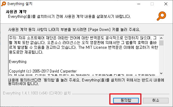 그리고 위에서 언어를 선택하면, 다음과 같이 사용권계약에 대해서 나타나게 됩니다. 여기에서 [동의함]을 클릭하여 주시면 됩니다.