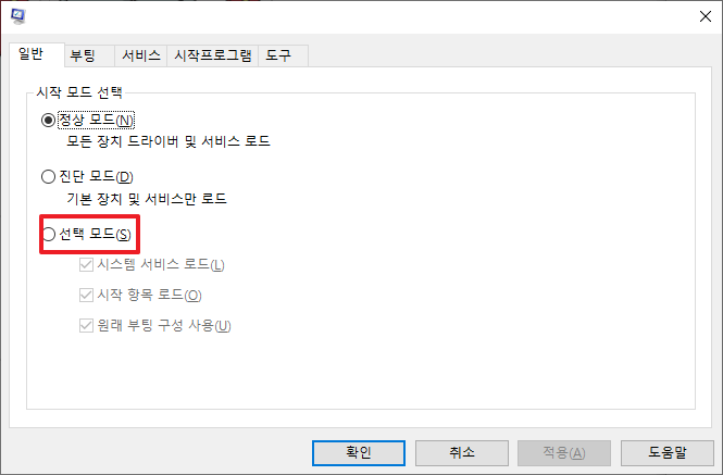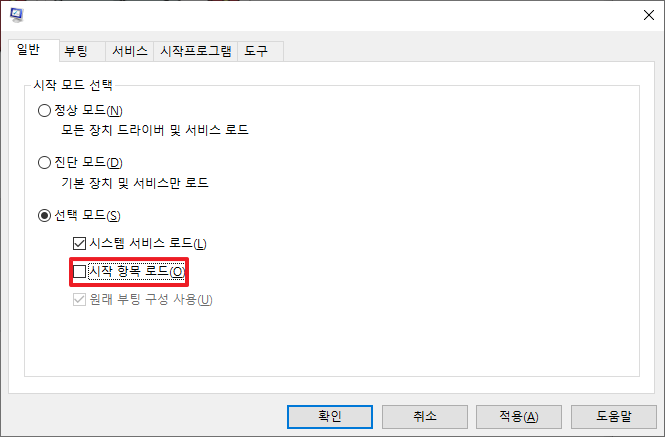 그럼 선택 모드를 선택하시면 하위에 몇가지 부분들을 추가로 선택할 수 있게 나타납니다. 여기에서 [시작 항목 로드]부분을 체크 해지하시길 바랍니다.