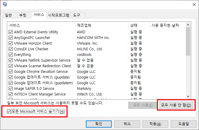 그런 후에 상단에 있는 [서비스]부분을 선택해 주시길 바랍니다. 그런 후에 좌측 하단에 있는 [모든 Microsoft 서비스 숨기기]을 체크 해주시길 바랍니다. Microsoft 서비스 의 경우 시스템 자체에 문제를 일으킬 수 있는 부분들도 존재하기 때문에 반드시 체크하여 관련된 부분들을 손대는 실수를 하지 않으시길 바랍니다. 그런 후에 우측 하단에 있는 [모두 사용 안함]부분을 클릭하여 주시길 바랍니다.
