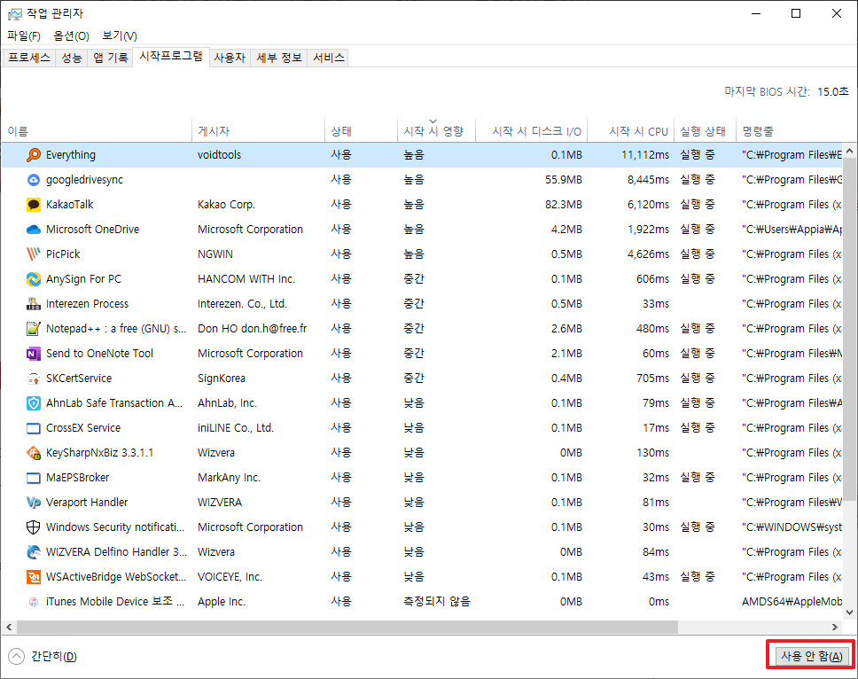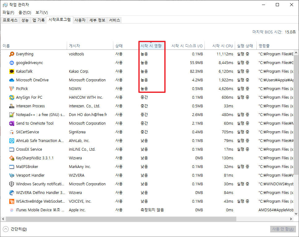 [윈도우10, windows10]윈도우 시작시 시작프로그램 로딩 속도 확인하기