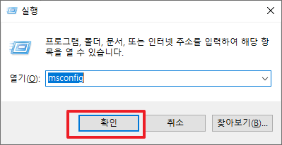 그리고 빨간 부분에 [msconfig]부분을 입력해 주시길 바랍니다.