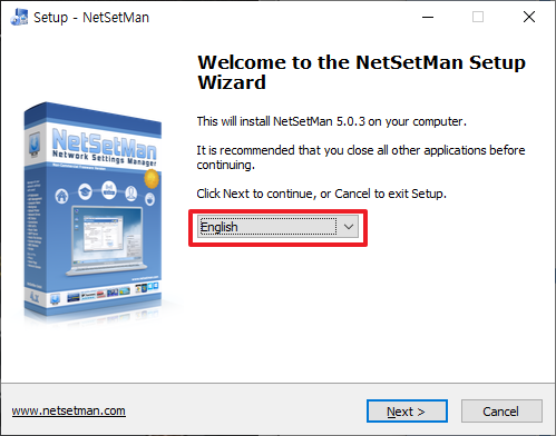 위에서 아이콘을 눌러서 NetSetMan을 설치를 시작하도록 하겠습니다. 버튼을 누르시면 최초에 다음과 같은 화면이 나타납니다. 다음에서 보이는 부분에서 제공하는 언어에는 한국어가 없습니다. 그래서 English로 설정하시고, [Next]부분을 클릭하여 주시길 바랍니다.