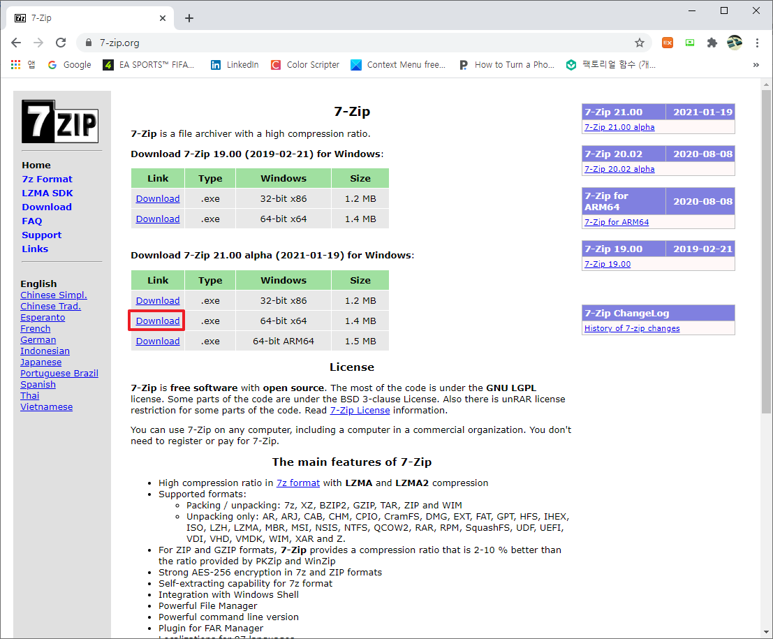 7-Zip 7-Zip is a file archiver with a high compression ratio. Download 7-Zip 19.00 (2019-02-21) for Windows: Link Type Windows Size Download .exe 32-bit x86 1.2 MB Download .exe 64-bit x64 1.4 MB Download 7-Zip 21.00 alpha (2021-01-19) for Windows: Link Ty