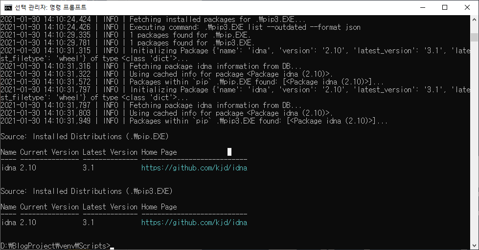 명령어 : pip install pipupgrade Collecting pipupgrade Downloading pipupgrade-1.8.4-py3-none-any.whl (87 kB) |████████████████████████████████| 87 kB 2.0 MB/s Installing collected packages: pipupgrade Successfully installed pipupgrade-1.8.4 WARNING: You are using pip version 20.0.2; however, version 21.0 is available. You should consider upgrading via the 'd:\blogproject\venv\scripts\python.exe -m pip install --upgrade pip' command. |