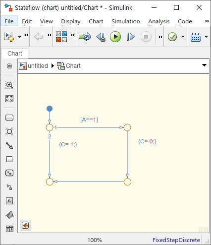 단 몇가지 사항을 조심하셔야 합니다. 위의 형태로 바꾸시면 기존 2번이었던 Transition이 1번 Transition이 됩니다. 이 부분에 대한 조건은 기입되지 않았습니다. 즉, 향후 이 부분에 대한 조건이 없기 때문에 무조건 {C=1;} 부분이 실행되고, 2번 Transition으로 넘어가지 않습니다.