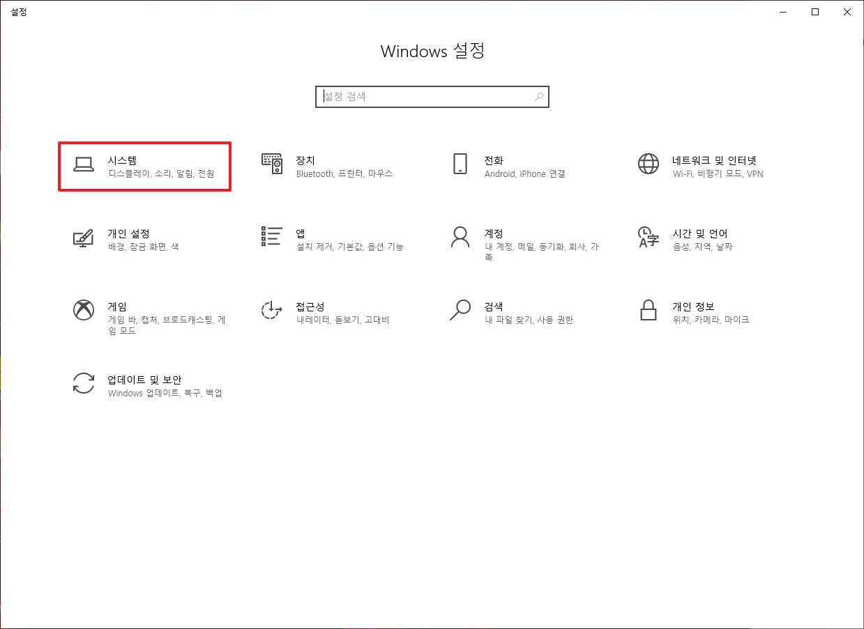 설정 메뉴를 보시면 다음과 같은 화면이 나타날 것입니다. 이 때 [시스템]부분을 클릭하여 주시길 바랍니다.