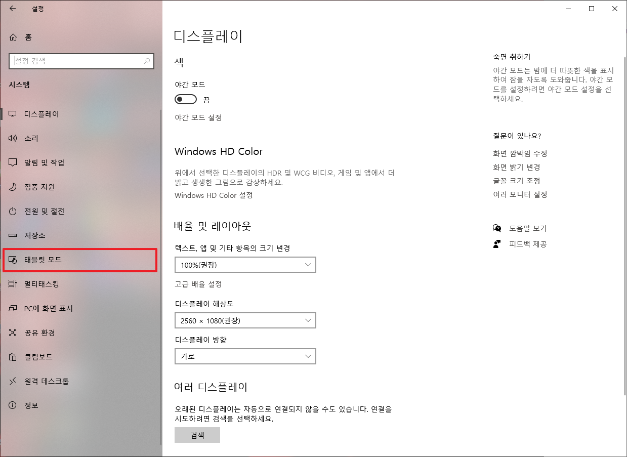 위에서 [시스템] 부분을 클릭하시면 다음과 같이 [시스템] 부분의 하위 메뉴들이 나타날 것입니다. 대부분은 디스플레이 부분이 먼저 표시가 됩니다. 그럴 경우, 좌측 메뉴에서 [태블릿 모드]부분을 클릭하여 주시길 바랍니다.