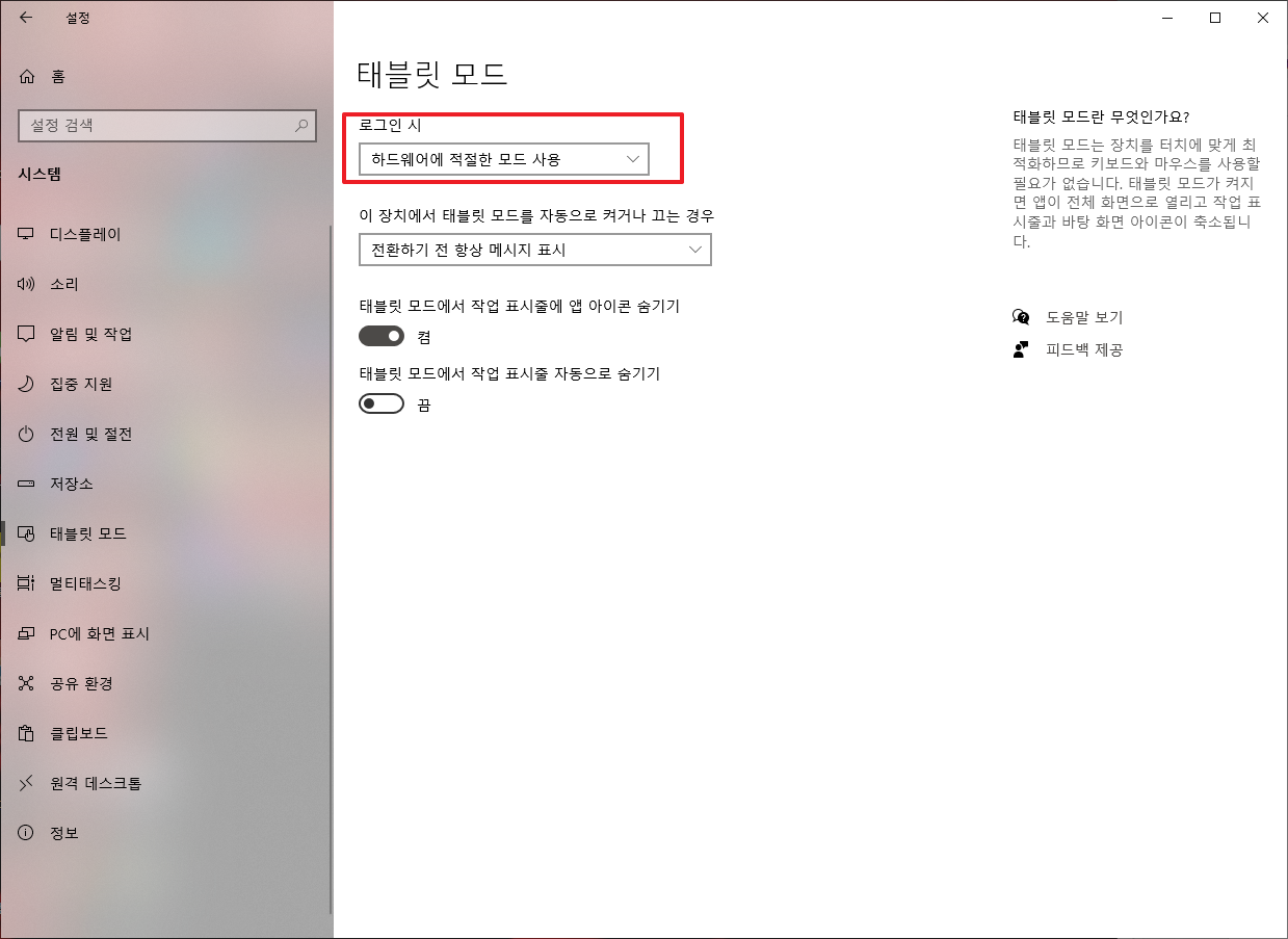 그럼 여기에서 태블릿 모드에 대한 설정이 나타납니다. 여기에서 [로그인 시] 부분을 클릭하여 주시길 바랍니다.